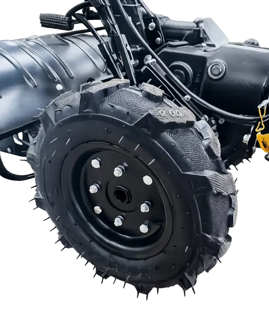 Ce motoculteur dispose de 2 grandes roues agricoles de 33cm de diamètre qui permettent un travail facile et efficace sur tous types de sols.